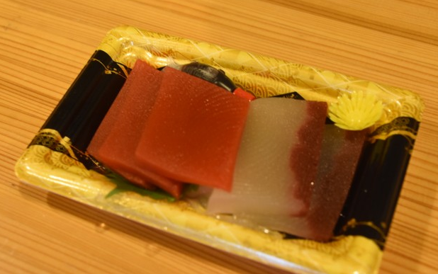 位于四日市市西日野町,于1948年创业“梦果子工房Kotoyo”推出的“生鱼片羊羹”,售价为含税648日元(约合人民币43元)。店家用羊羹模仿金枪鱼和鰤鱼的生鱼片外观,为了再现横断面,还用细线切开,细节之处也处理得十分完美,制作工艺非常讲究。