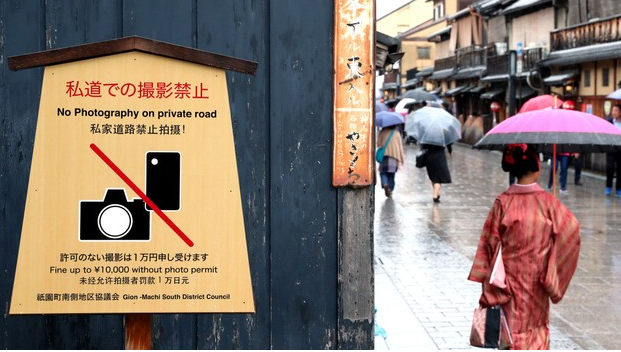 “私家道路禁止拍照”、“请不要触摸提灯”等提示牌设立在花见小路上。在位于京都市东山区的花街祇园,因到访的观光客而带来的困扰,甚至已经成为了观光公害。当地居民发出了“这样下去祇园的风情就会消失”的声音,日本国土交通省等也在不间断进行着通过智能手机呼吁遵守礼仪的实证试验。